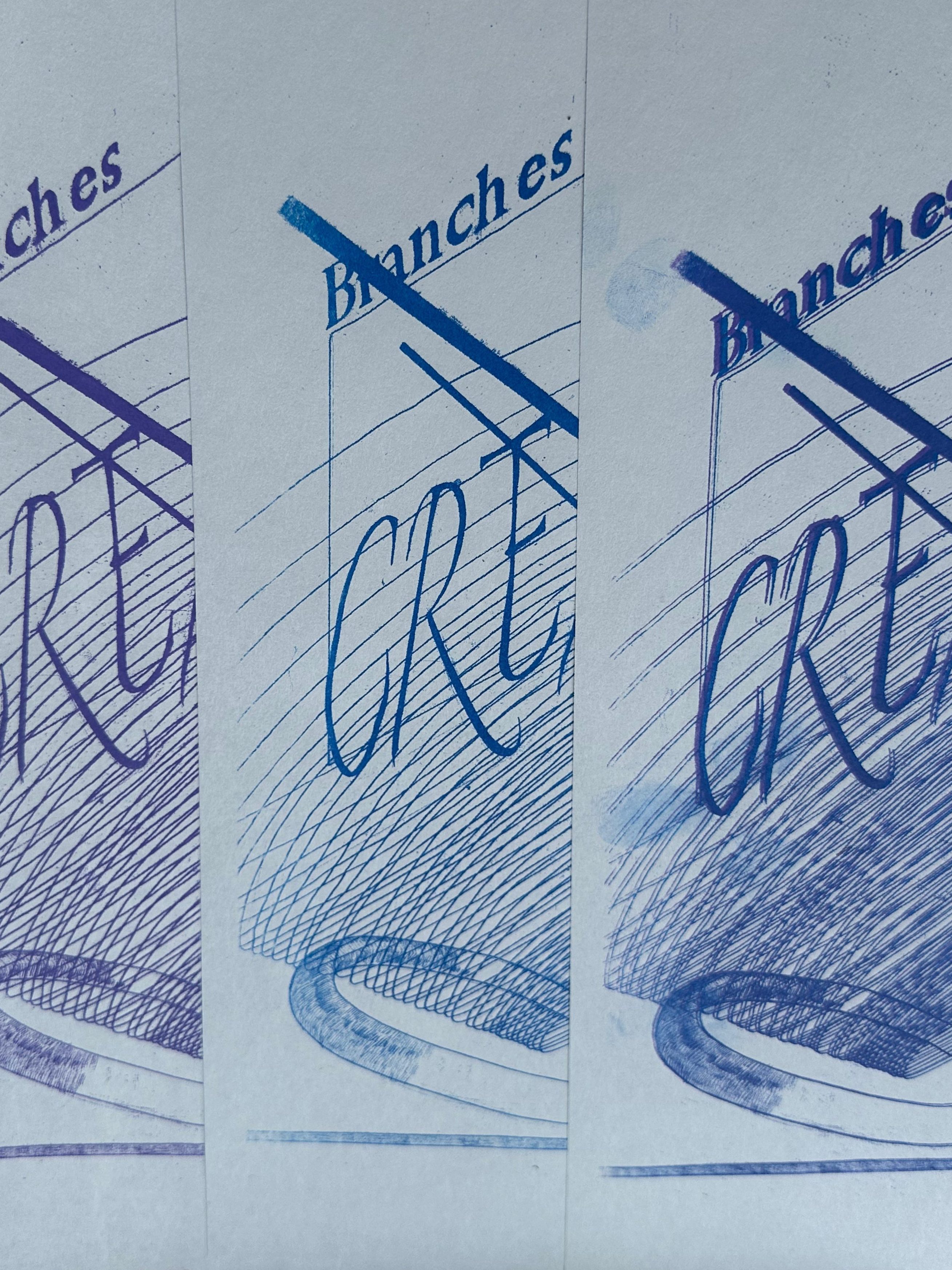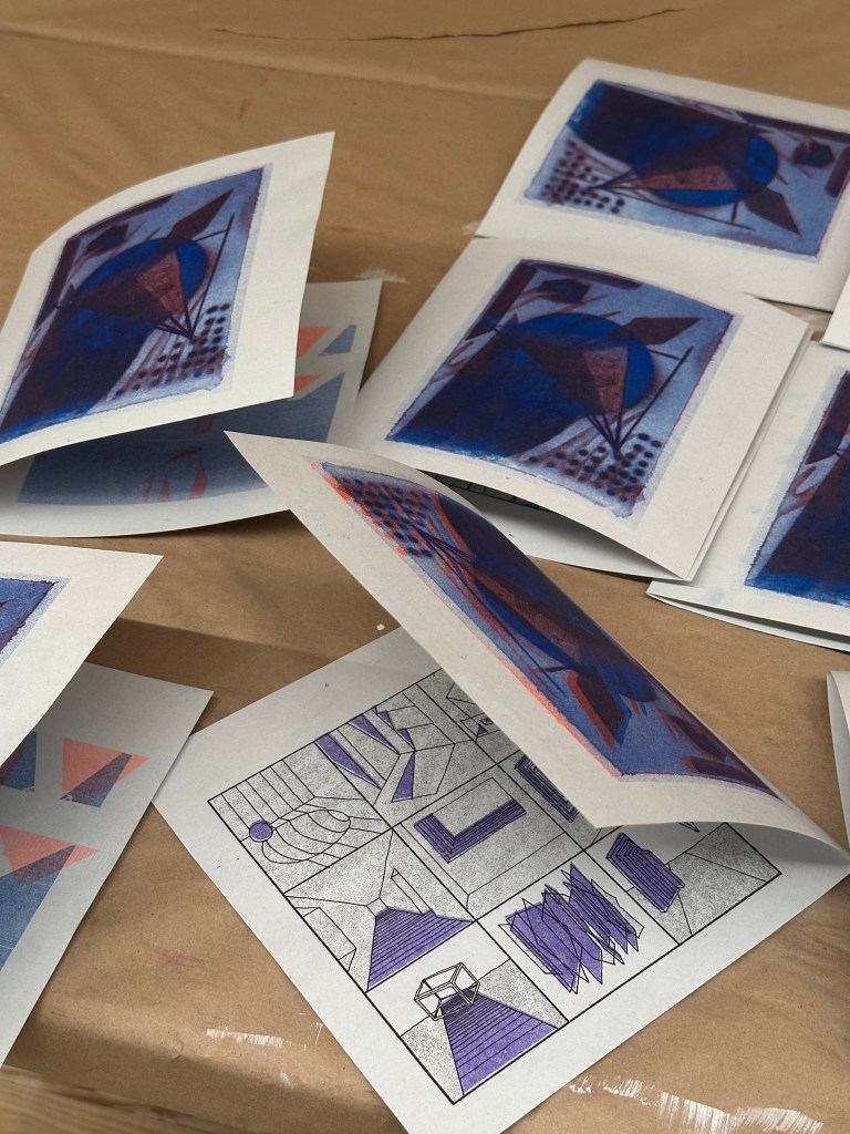 RISO printed, with purple and blue ink on grey cardboard paper.